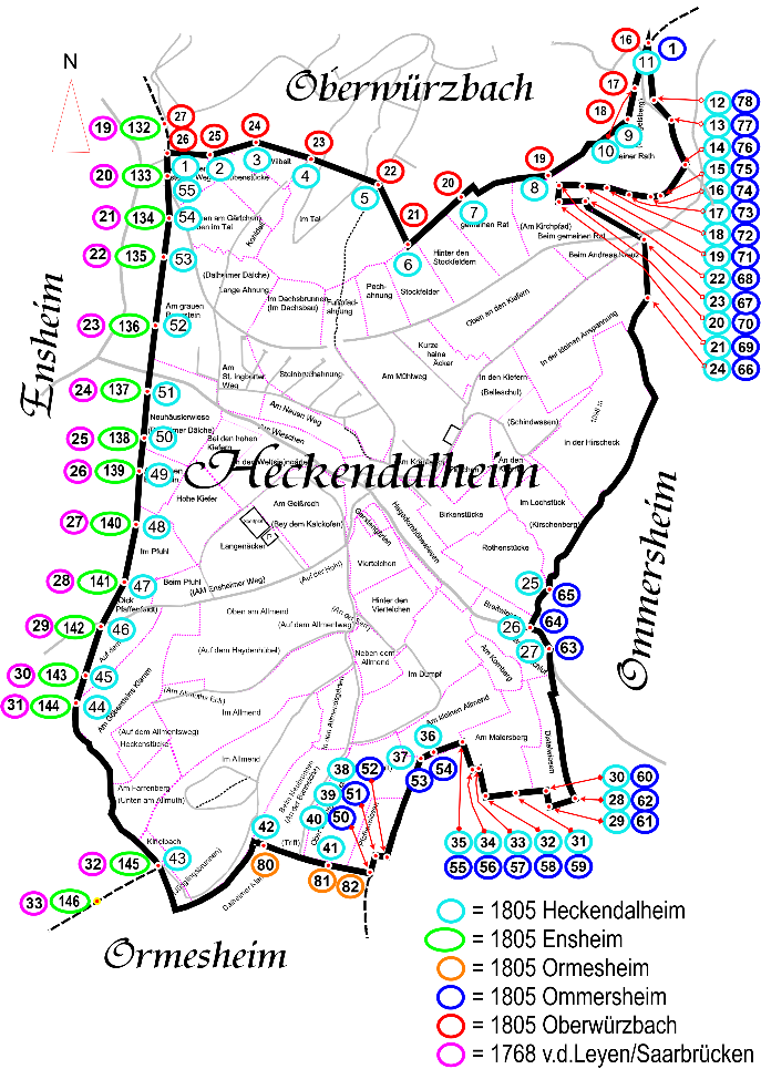 Die Darstellung zeigt den Heckendalheimer Bann mit allen Grenzpunkten.