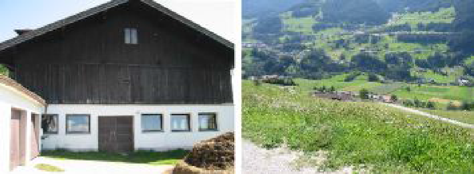Das Bild unten rechts zeigt die Sicht vom Hof ins Wipptal, im Hintergrund die Brennerautobahn.
