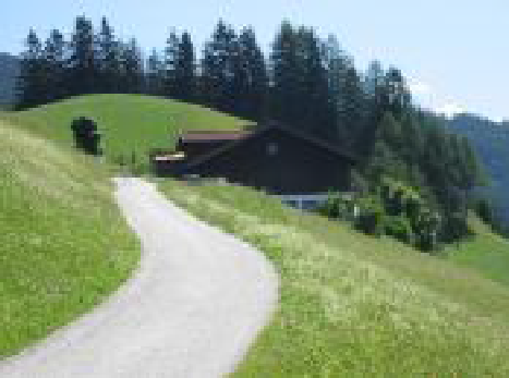 Das Bild oben links zeigt die Anfahrt zum Hof, der Asphaltweg endet am Hof Ich musste auf der schmalen Straße umwenden, rechts geht’s bergab, links geht’s bergauf.