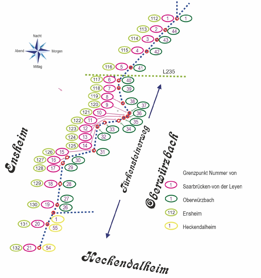- Von diesem in nehmlicher Linie immer bergauf 44 Ruten 5 Schuh zum 19ten Stein so der letzte ist, welcher an dem Türkensteiner Weg stehet, und scheiden sich zwischen diesem und dem folgenden 20ten Stein die Bänne Oberwürtzbach und Ensheim dergestalt, daß die Grenze des letztern Dorfbannes die Gemarkung von Oberwürtzbach verlässet und mit dem Heckendalheimer Dorfbann fortzieht.