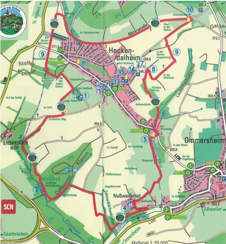Er folgt soweit es möglich war der Banngrenze, verläuft bis auf eine Ausnahme (Nussweilerhof) nur auf Heckendalheimer Bann.